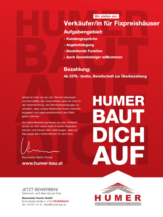 Baumeister Humer GmbH – Baumeister Zimmermeister Baumarkt  »  JOB  »  Verkäufer/in für Fixpreishäuser